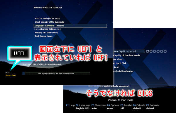 MX Linuxの起動に成功すると起動メニューが表示されます。 PCのファームウェアインタフェースが UEFIかBIOSかで起動メニューは異なります。 それぞれ手順が異なりますので、お使いのPCに合わせて実施してください。