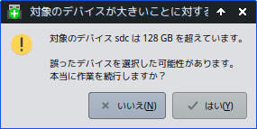 上図のように "USBデバイスのターゲットを選択" にはデバイスの一覧が表示されます。 この一覧のデバイス名を記録しておいてください(上図の例では sdc のみ)。